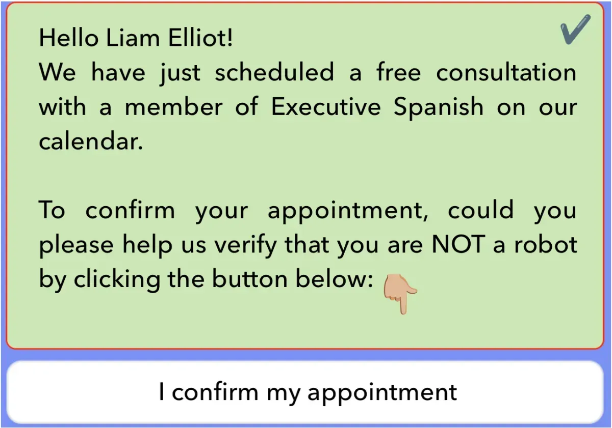 #1 Confirm Your Session in Your Email We receive many fake or bot appointments, so we've sent you an email with your appointment details and coordinates. Please confirm your appointment now by clicking "Yes, I will attend." If you don't confirm your appointment within the next 15 minutes, the system will automatically cancel it.